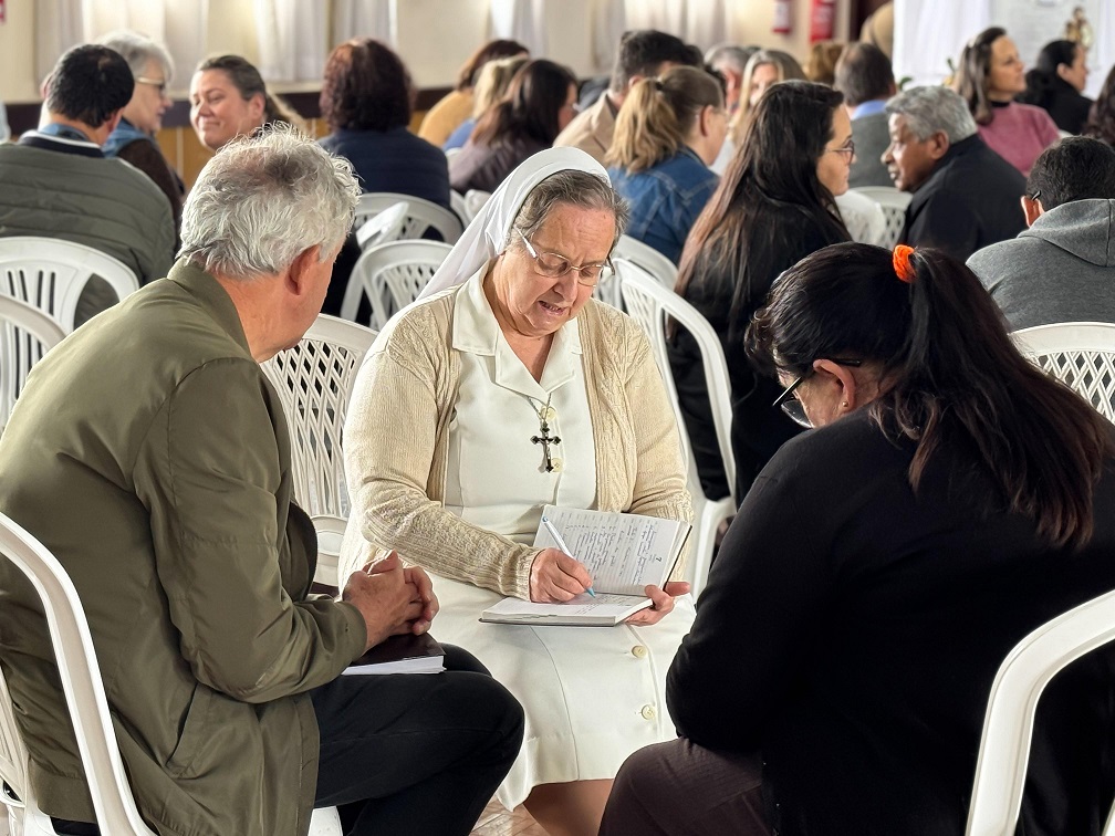 O primeiro tema foi vivenciado em ressonância em trios, seguida de partilha coletiva. A dinâmica, conduzida por Ir. Elisiane Borges, favoreceu a escuta mútua e o discernimento sobre os principais apelos do Documento Final à luz das realidades paroquiais. Ao final, os participantes partilharam palavras, imagens e sentimentos que expressaram o que mais tocou cada grupo.