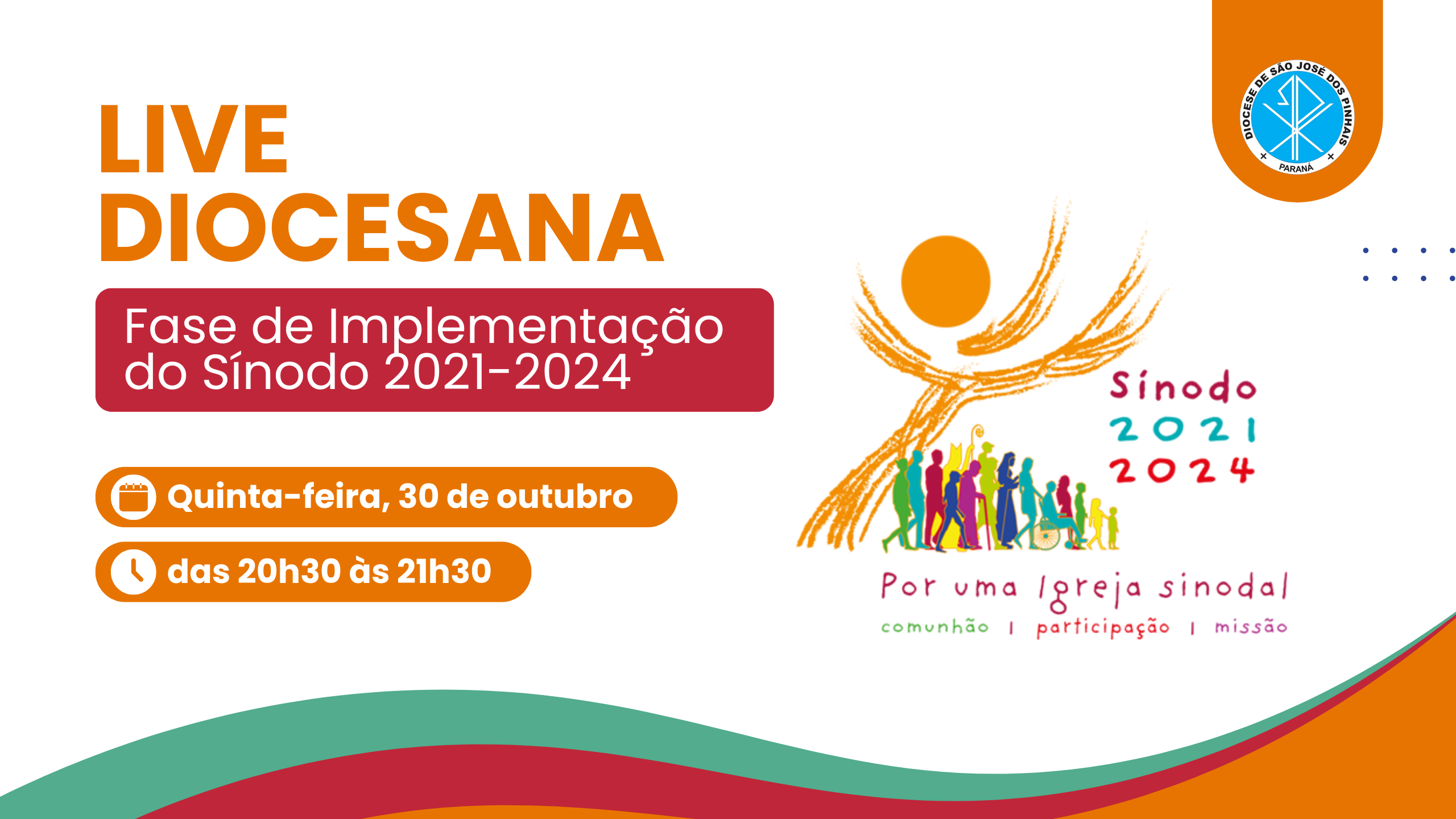 A Coordenação da Ação Evangelizadora promoverá, na próxima quinta-feira, 30 de outubro, das 20h30 às 21h30, uma Live Diocesana sobre a Fase de Implementação do Sínodo 2021–2024. O encontro será transmitido ao vivo pelo canal da Diocese no YouTube, reunindo lideranças, agentes de pastorais, movimentos, organismos e comunidades diocesanas. O momento marca a continuidade do percurso Diocesano de Implementação, iniciado em setembro, e se insere no conjunto de ações que a Diocese vem realizando rumo à fase de implementação do processo sinodal (2025–2028). Essa nova etapa representa um compromisso em viver a sinodalidade como estilo permanente de ser Igreja, reforçando a comunhão, a participação e a missão em todas as comunidades.