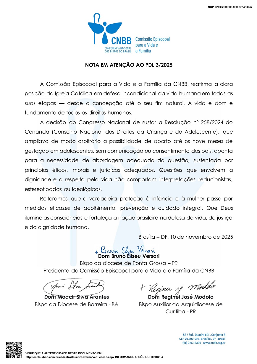 A Comissão Episcopal para a Vida e a Família da CNBB publicou nota oficial em 10 de novembro de 2025, reafirmando a posição clara da Igreja Católica em defesa incondicional da vida humana, desde a concepção até o seu fim natural.