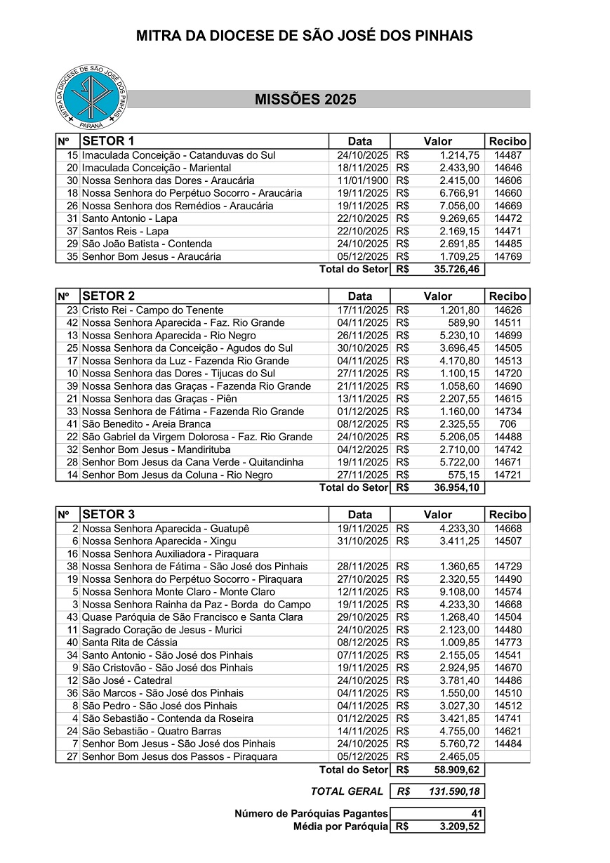 Com gratidão e alegria, comunico à nossa Diocese o resultado da Campanha Missionária, realizada em todas as Paróquias no penúltimo final de semana do mês de outubro, iluminada pelo tema “Missionários da esperança entre os povos” e pelo lema “A esperança não decepciona” (Rm 5,5). A generosidade de tantos fiéis testemunha uma Igreja viva, comprometida e atenta às necessidades dos irmãos e irmãs espalhados pelo mundo.