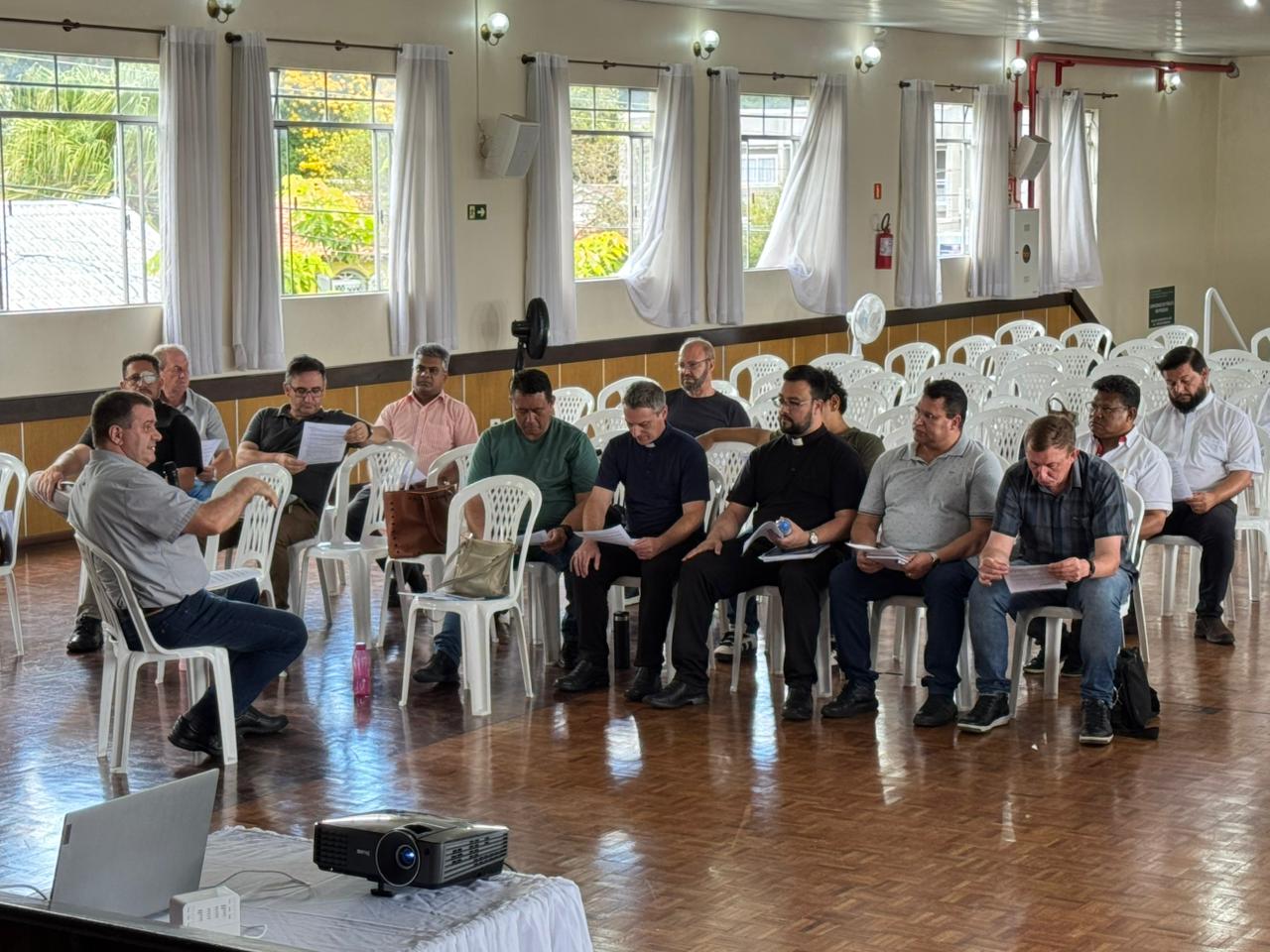 Em momento reservado aos presbíteros, foi apresentado o Resumo do Plano de Ação Diocesano para o discernimento, formação e instituição do Ministério de Catequista. A exposição foi conduzida por Léo Marcelo Plantes Machado, e Pe. Celmo Suchek de Lima, que detalharam o percurso orgânico e progressivo pensado para a Diocese.
