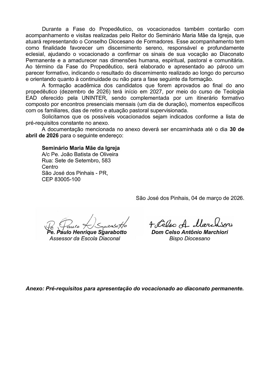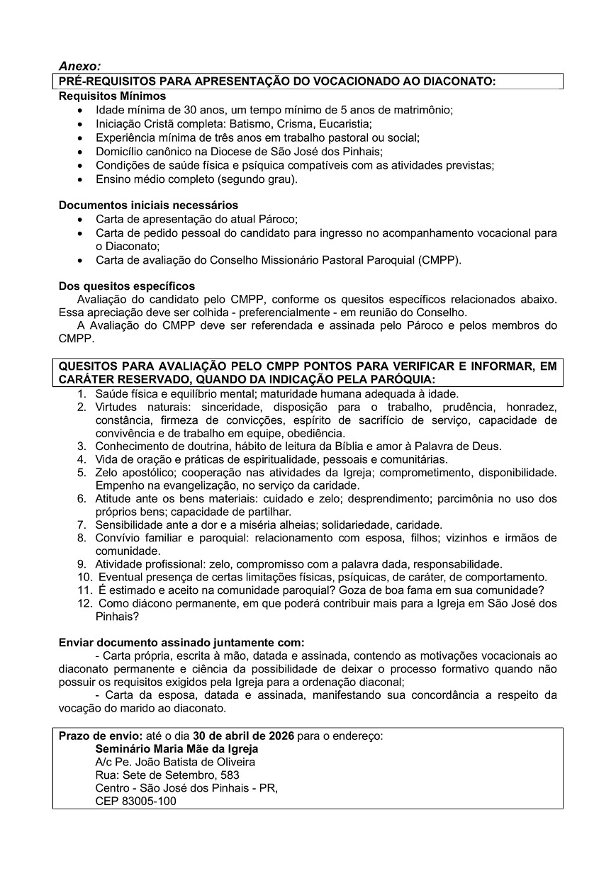 - Até 30 de abril de 2026 – Envio da documentação dos indicados ao Pe. João Batista de Oliveira, no Seminário Maria Mãe da Igreja.