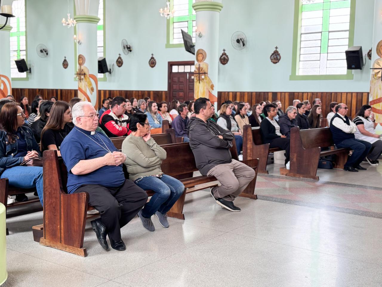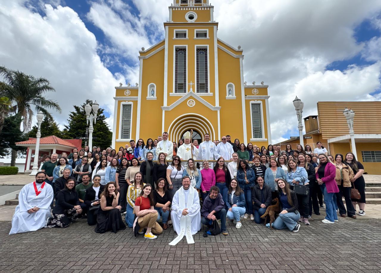 A manhã iniciou com a acolhida e uma breve procissão até a Igreja Matriz do Senhor Bom Jesus, introduzindo o clima espiritual do dia. Em seguida, os colaboradores participaram da Catequese Jubilar, conduzida pelo Pe. Celmo Suchek de Lima, coordenador da Ação Evangelizadora Diocesana, que refletiu sobre o chamado de Jesus em Mateus 5,13-16: “Vós sois o sal da terra. Vós sois a luz do mundo.”