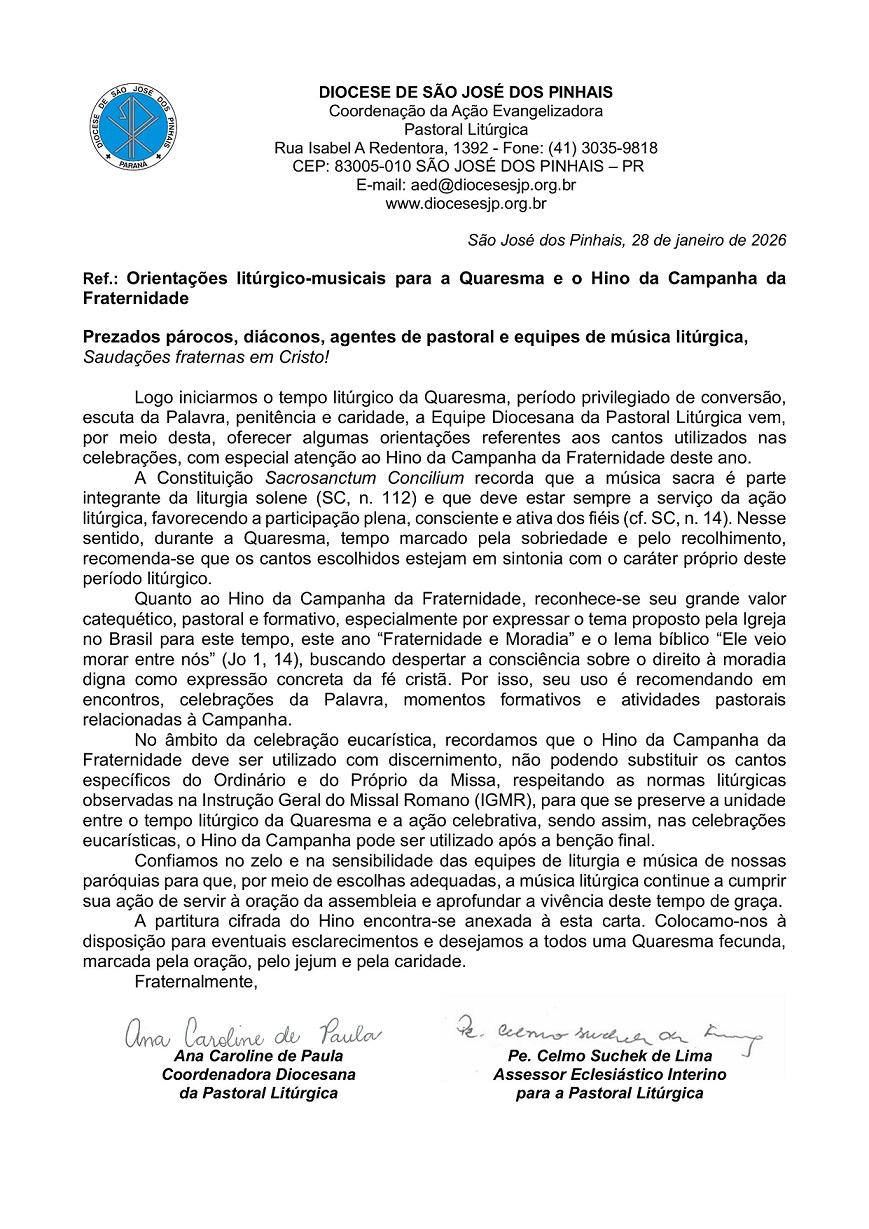 ORIENTAÇÕES LITÚRGICO-MUSICAIS PARA A QUARESMA E O HINO DA CAMPANHA DA FRATERNIDADE 28 JANEIRO 2025 PASTORAL LITÚRGICA
