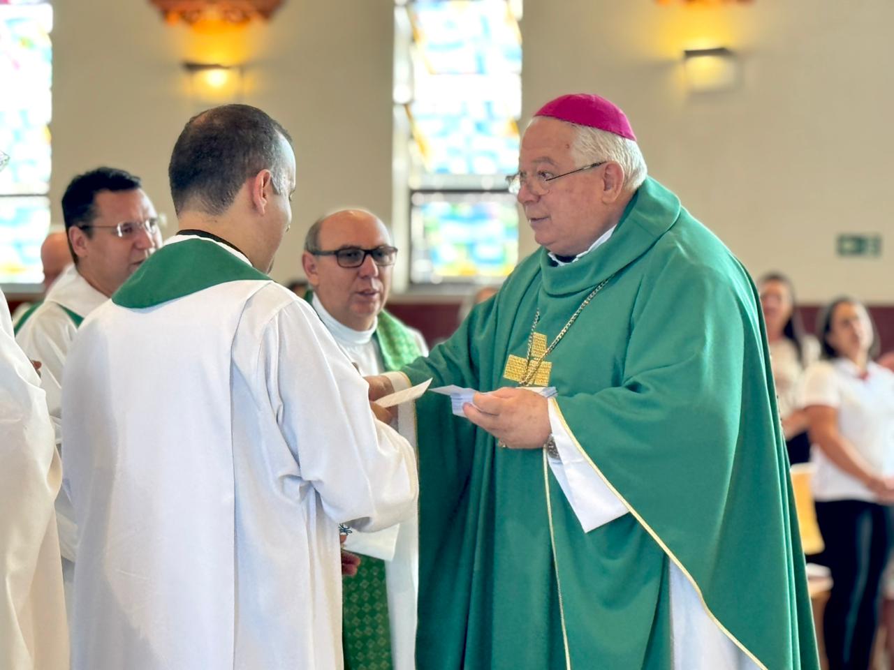 Após a homilia, foi realizado um momento de compromisso de comunhão, participação e missão, motivado pelo Pe. João Maria Rodrigues Stech, Vigário Geral da Diocese. Inspirados pela Palavra proclamada e pelo caminho sinodal da Igreja, presbíteros, diáconos e colaboradores foram convidados a expressar publicamente o desejo de cultivar atitudes concretas de uma Igreja mais fraterna e missionária. A cada interpelação, todos responderam com firmeza o compromisso assumido. Ao final, Dom Celso entregou a cada participante, em suas mãos, um cartão com a oração que motivava a comunhão, a participação e a missão, como sinal visível da unidade e do envio para a caminhada sinodal.