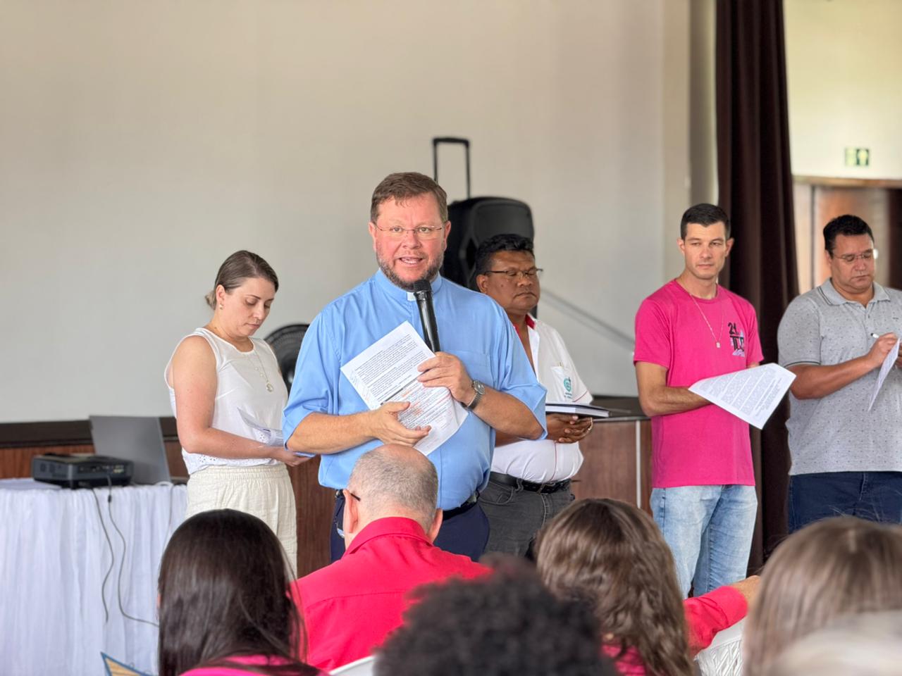 A programação iniciou-se com a Santa Missa presidida por Dom Celso Antônio Marchiori, que destacou que o encontro não era “uma simples reunião de trabalho, mas um momento de Igreja, Corpo unido de Cristo, que se reúne para escutar o Espírito”. Em sua homilia, o bispo recordou que a conversão pastoral nasce de uma conversão pessoal: “Estruturas, costumes e até métodos pastorais podem, se não vigiarmos, ocupar o lugar do essencial. Às vezes caímos na tentação de dizer: ‘Sempre foi assim’. Isso nos impede a mudança.”
