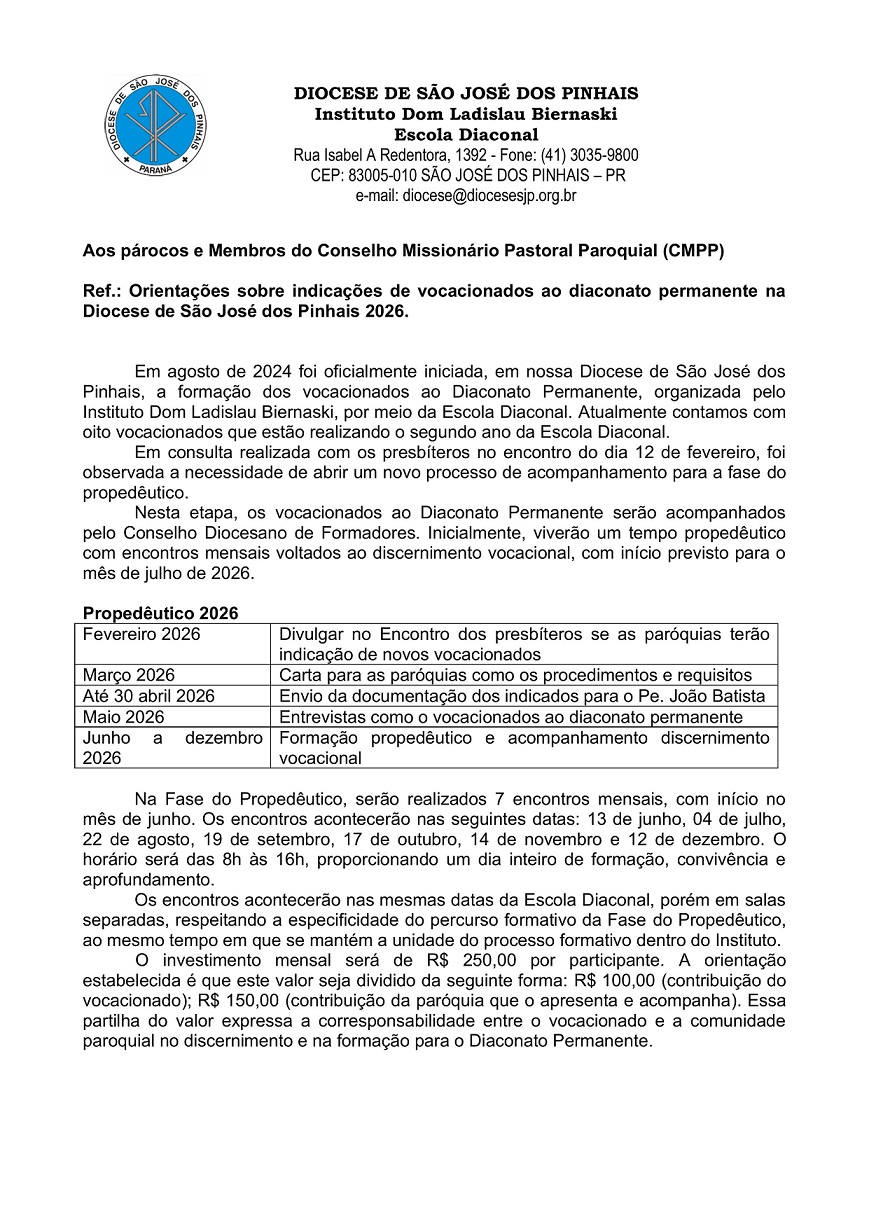 A Diocese de São José dos Pinhais, por meio do Instituto Dom Ladislau Biernaski e da Escola Diaconal, iniciou oficialmente o processo de indicação e acompanhamento de novos vocacionados ao Diaconato Permanente para o ano de 2026.